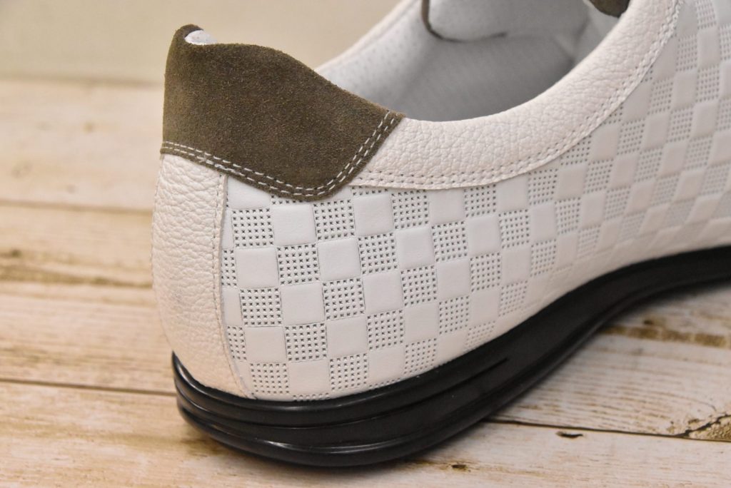色遣いとしては白と茶色のみですが、型押しのデザインによってチェックに見えたり、シボの表情が柔らかく見えたり、もうこれでもか!と職人さんのこだわりが感じられる一足となっています。